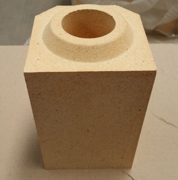 流鋼磚是砌在鑄錠用底板的溝槽內連通分鋼磚和鋼錠模的中空耐火磚,俗稱湯道磚。產品一般為有多種規格的長方體形中空黏土磚。為減小鋼液流動過程中的阻力并防止漏鋼,要求流鋼磚內孔光滑,外形規整,接縫嚴密。